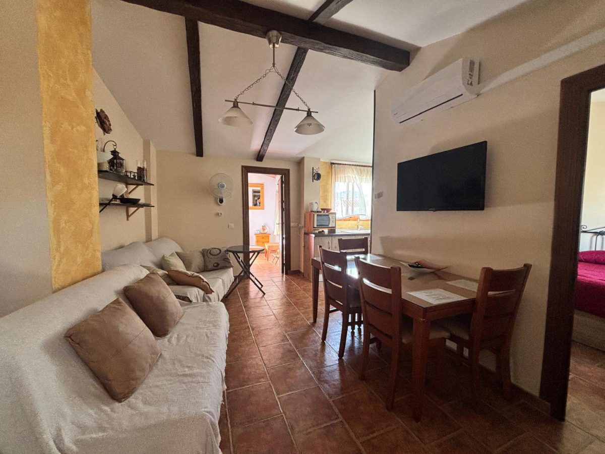 En la segunda planta se sitúa el tercer apartamento, que cuenta con salón con estufa de forja y cocina abierta, dos dormitorios dobles, baño completo y una gran terraza soleada con agradables vistas al pueblo.